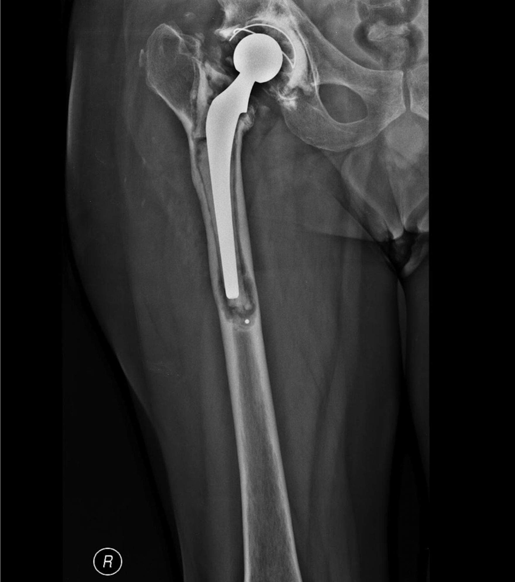 Radiograph showing aseptic loosening of the femoral component of a total hip replacement